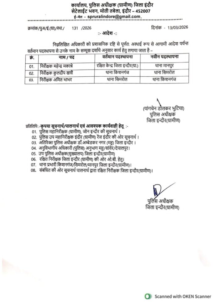 इसके साथ ही विभागीय स्तर पर अन्य थानों में भी बदलाव किए गए हैं। किशनगंज थाना प्रभारी कुलदीप खत्री को सिमरोल थाने में पदस्थ किया गया है, जबकि सिमरोल थाना प्रभारी अमित कुमार को किशनगंज थाने की जिम्मेदारी दी गई है।
